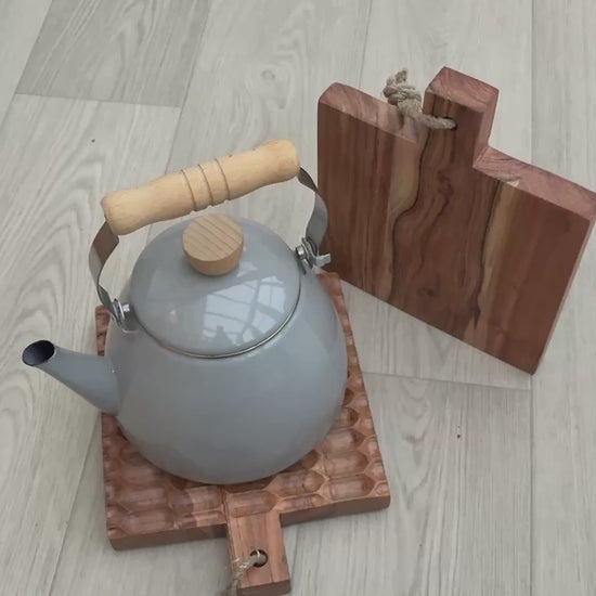 This item is multi functional. Not only is the carved surface beautiful to look at, it allows air to flow beneath a hot item placed on its surface. Flip the board over and the underside can be used as either a small chopping board or food presentation board. The ideal solution for small kitchens where space is limited.