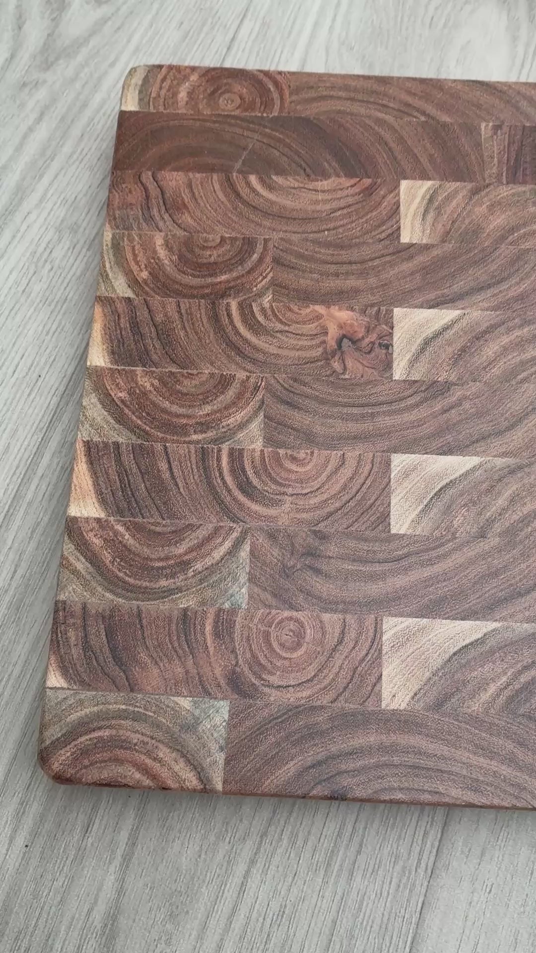 Elevate your culinary experience with this stunning end grain Acacia wood cutting board, meticulously crafted to perfection with discreet cut handles underneath. Spacious, practical and elegant to impress your guests. Great for barbecues and special occasions, it has ample space for meat, garnishes and sides.